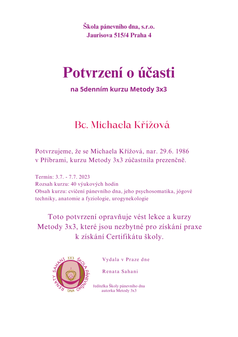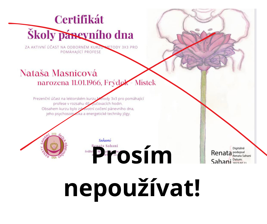 jak to s Certifikáty funguje? Pro zjednodušení: děláte praktické a písemné zkoušky? dokládáte praxi a náslechy? Tak to jste lektorkou Školy pánevního dna a Metody 3x3 a dostáváte jeden z Certifikátů vlevo. Pouze jste si koupila jen videokurz? Neúčastníte se naživo, ani Zoomeme? Dostáváte pouze potvrzení o zakoupení videokurzu /což plní faktura/. Chodila jste na lektorský kurz jste naživo, ale ke zkouškám jste nešla? Máte nárok na potvrzení o účasti na kurzu bez zkoušek /vpravo/. Zkoušky si můžete dodělat, stejně jako licenci na Tajemství II. Podmínky jsou níže.
